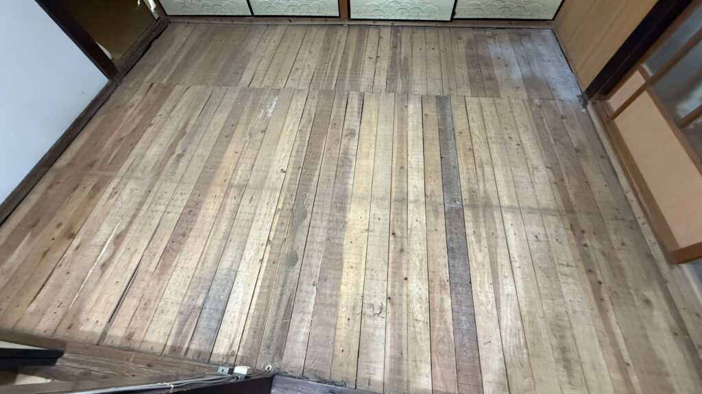 古民家の床は水平がとれてなかったりするので、畳をめくって床材を敷いたら終わりといかないのが難しいところ。大引きからのやり直しになると大仕事になります。